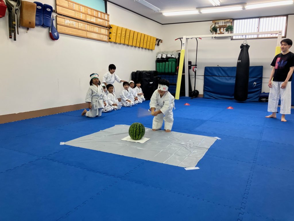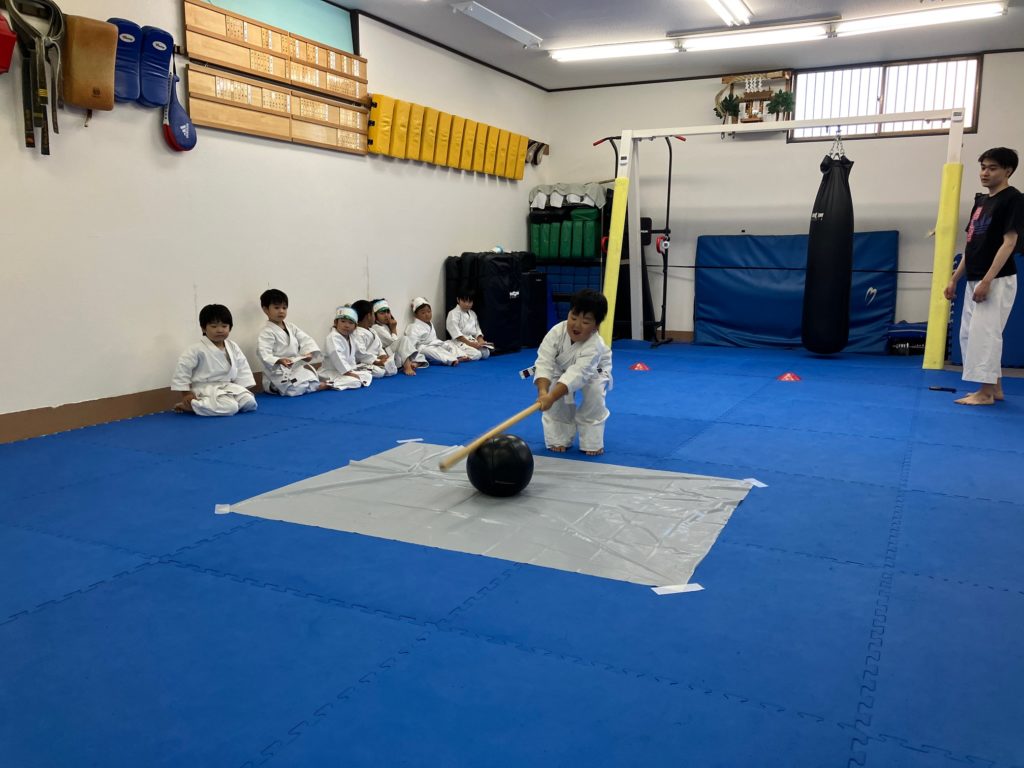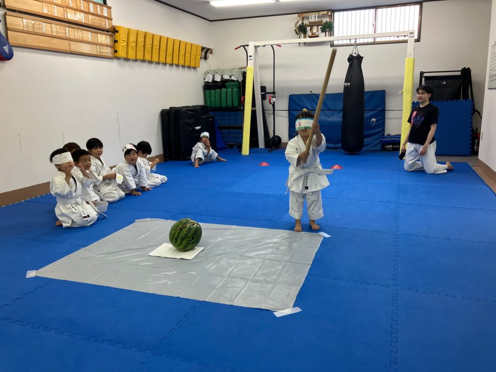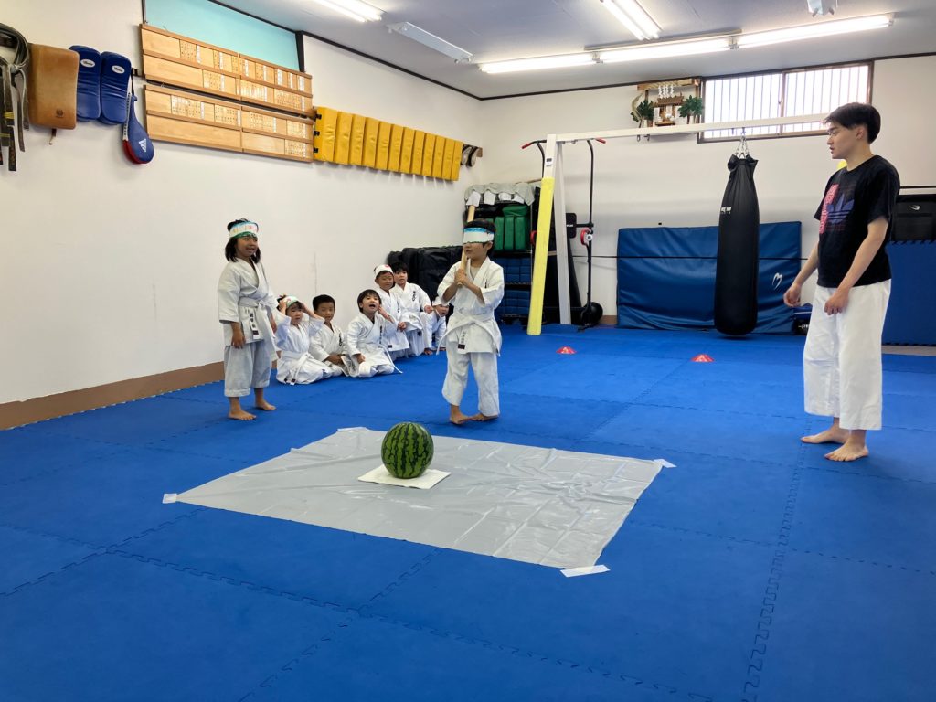 マスクの製作が終わったら栗原が簡単にスイカ割りのレクチャーをして、大人の稽古で試合に出場する人がお腹に【ドン!ドン!】と落とすメディシンボールをスイカに見立てて一回ずつ練習しました!
