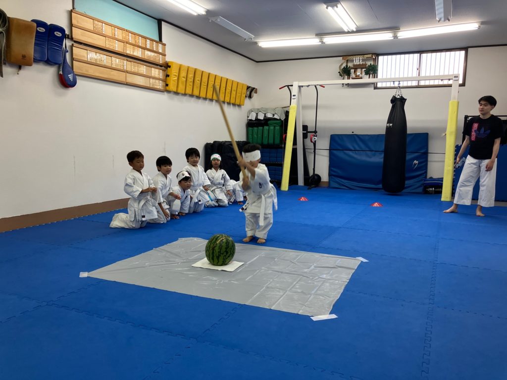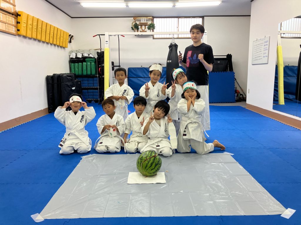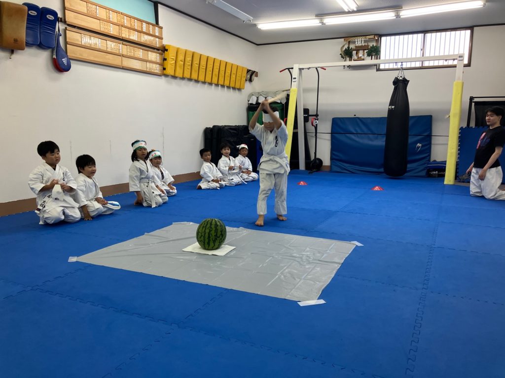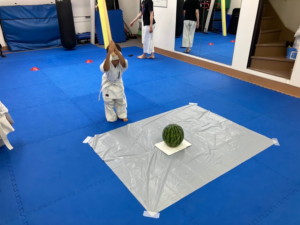 マスクの製作が終わったら栗原が簡単にスイカ割りのレクチャーをして、大人の稽古で試合に出場する人がお腹に【ドン!ドン!】と落とすメディシンボールをスイカに見立てて一回ずつ練習しました!