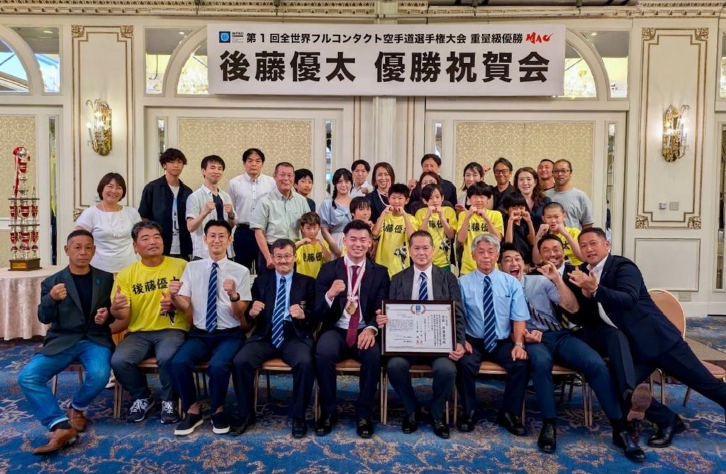 この度、5月31日(土)6月1日(日)有明アリーナにて盛大に開催されました、【第1回 全世界フルコンタクト空手道選手権大会】男子重量級にて優勝しました、空手道MAC本部道場所属の後藤優太選手の優勝祝賀会に出席致しました。