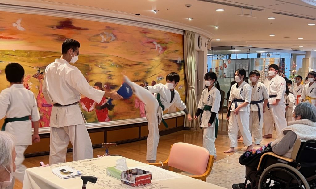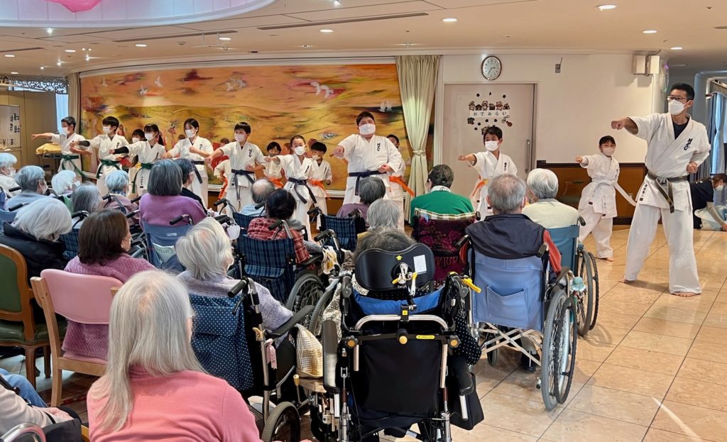 事前に趣旨を説明した募集手紙を少年部道場生に配布して、16名の道場生が施設で暮らしたり通いの利用者の皆様へ元気を届けにいつものカラテを披露してきました!