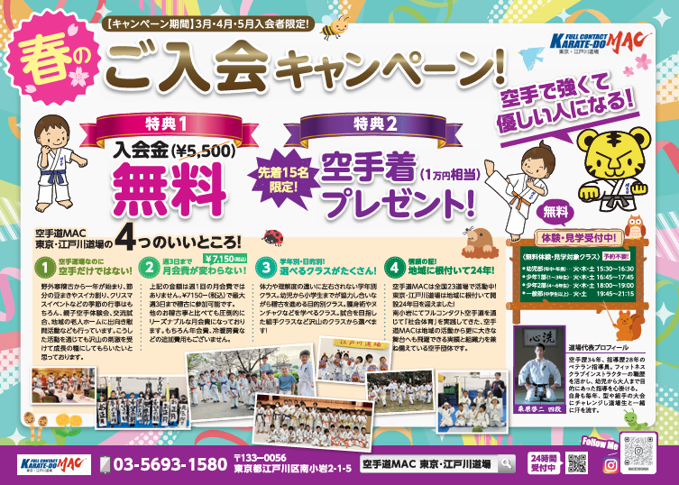 この機会に、是非、兄弟、お友達をお誘い合わせの上、空手道MAC 東京・江戸川道場に見学・体験にいらして下さい。